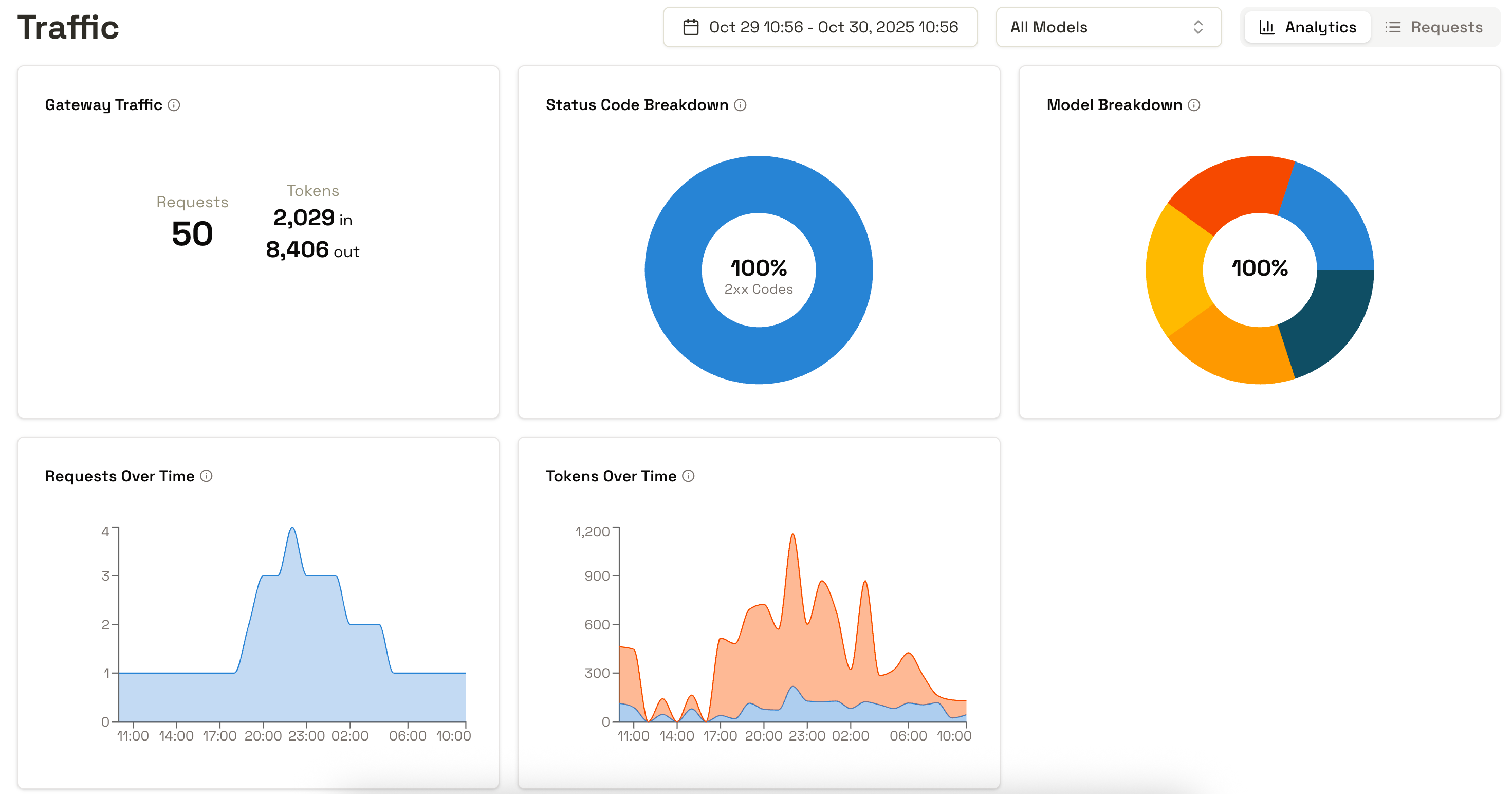 Traffic analytics showing gateway metrics, status codes, model breakdown, and usage over time