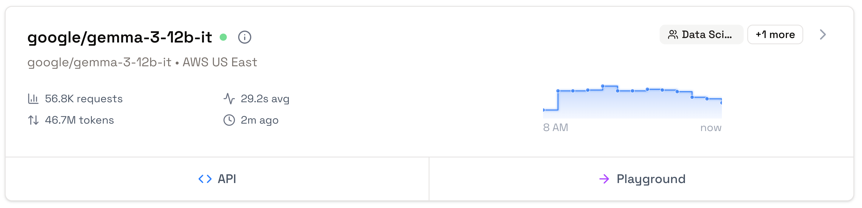 At a glance model metrics showing request counts, token usage, and average response times